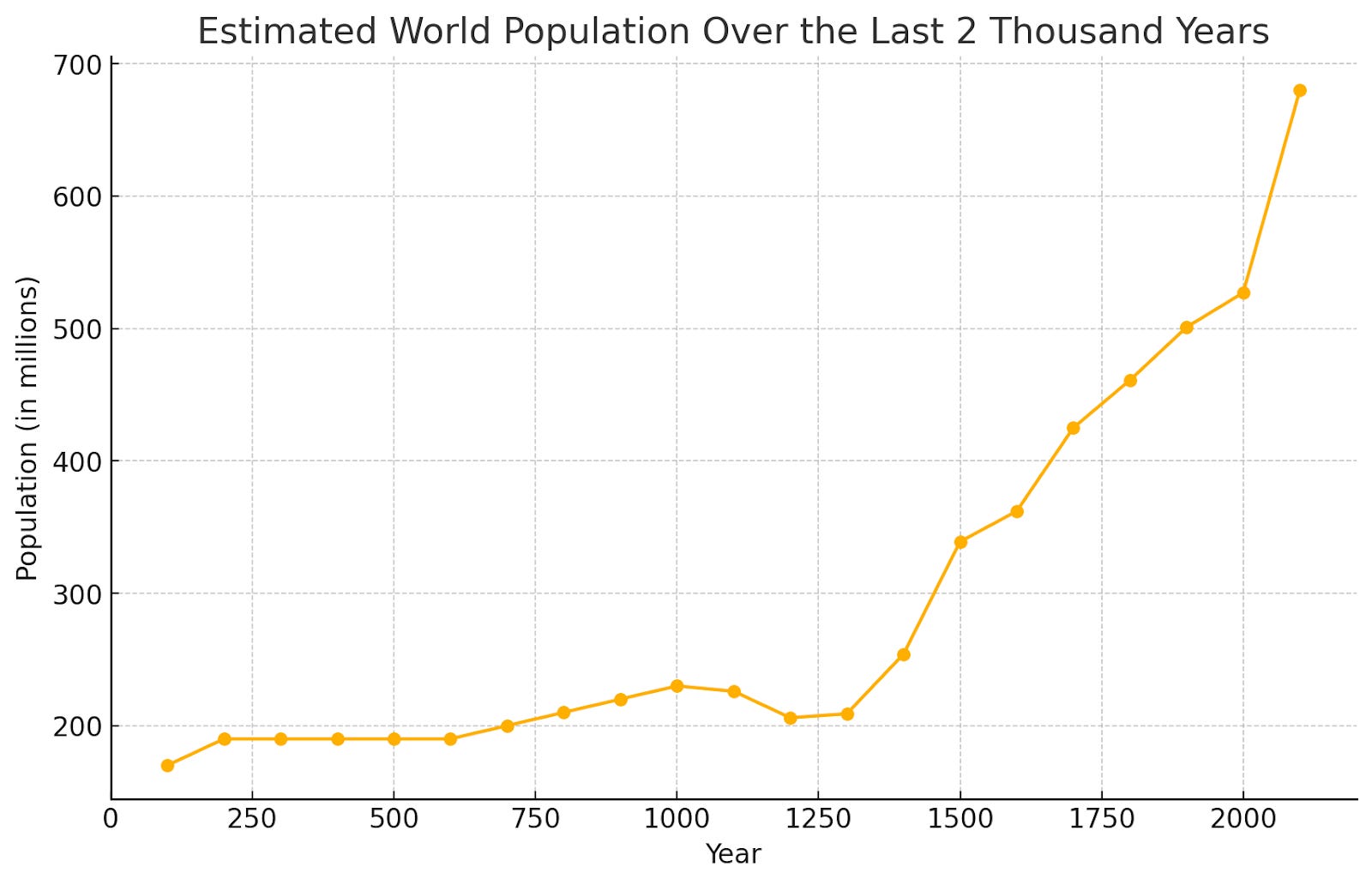 It has been nearly a thousand years since we last saw the total number of humans on this planet decrease year by year. For nearly a millennium we have lived with growing populations, and faster rates of growth. But in the coming decades, for the first time in a thousand years, the number of deaths on the planet each year will exceed the number of births. This seems hard to believe at first because superficially there is no evidence for that change in direction. As this chart shows, the line wants to go up.