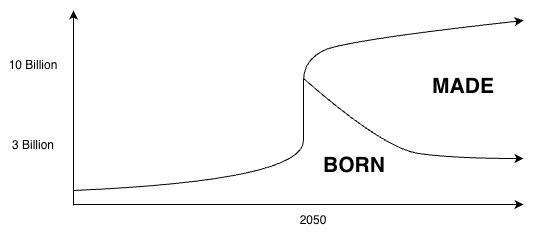 I think it is no coincidence that at the historical moment that humans progress themselves to the point of not breeding because it is inconvenient, that they invent a million virtual beings, a billion artificial minds, trillions of robots and a zillion working agents. Think of this as a handoff – a shift from one regime based on the biologically born to another based on the manufactured made. We are in transition from the world of the Born handing off to the world of the Made.