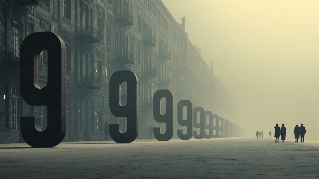 This lift is tremendously hard for very mundane reasons. The addition of a nine in the march of nine is not linear. It seems as if we are adding only a tiny amount with each nine, smaller and smaller, but it is the opposite. The difference between having no electricity for 1 hour a year (99.99%) versus missing one whole working day a year (99.9%) is significant, and not just a little more.